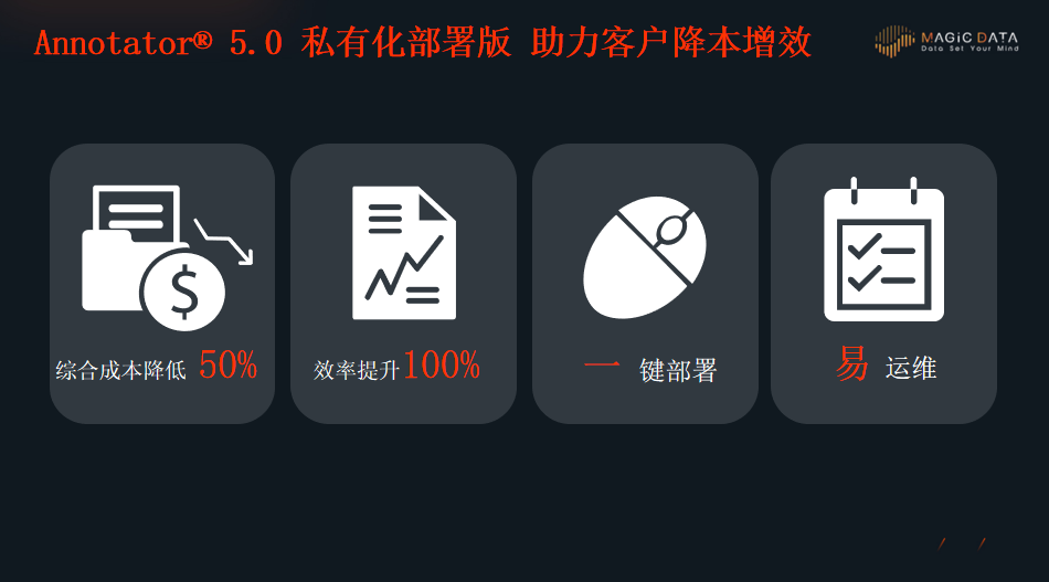 在确保数据安全前提下,提高数据标注效率是企业重要考量因素之一。magic data以深厚的技术实力打造的annotator® 5.0私有化部署版,以效率提升为核心,增加符合市场需求的新功能,进一步优化数据标注体验,为行业、企业和标注者提供一款安全、高效的标注平台,帮助企业真正做到降本增效。