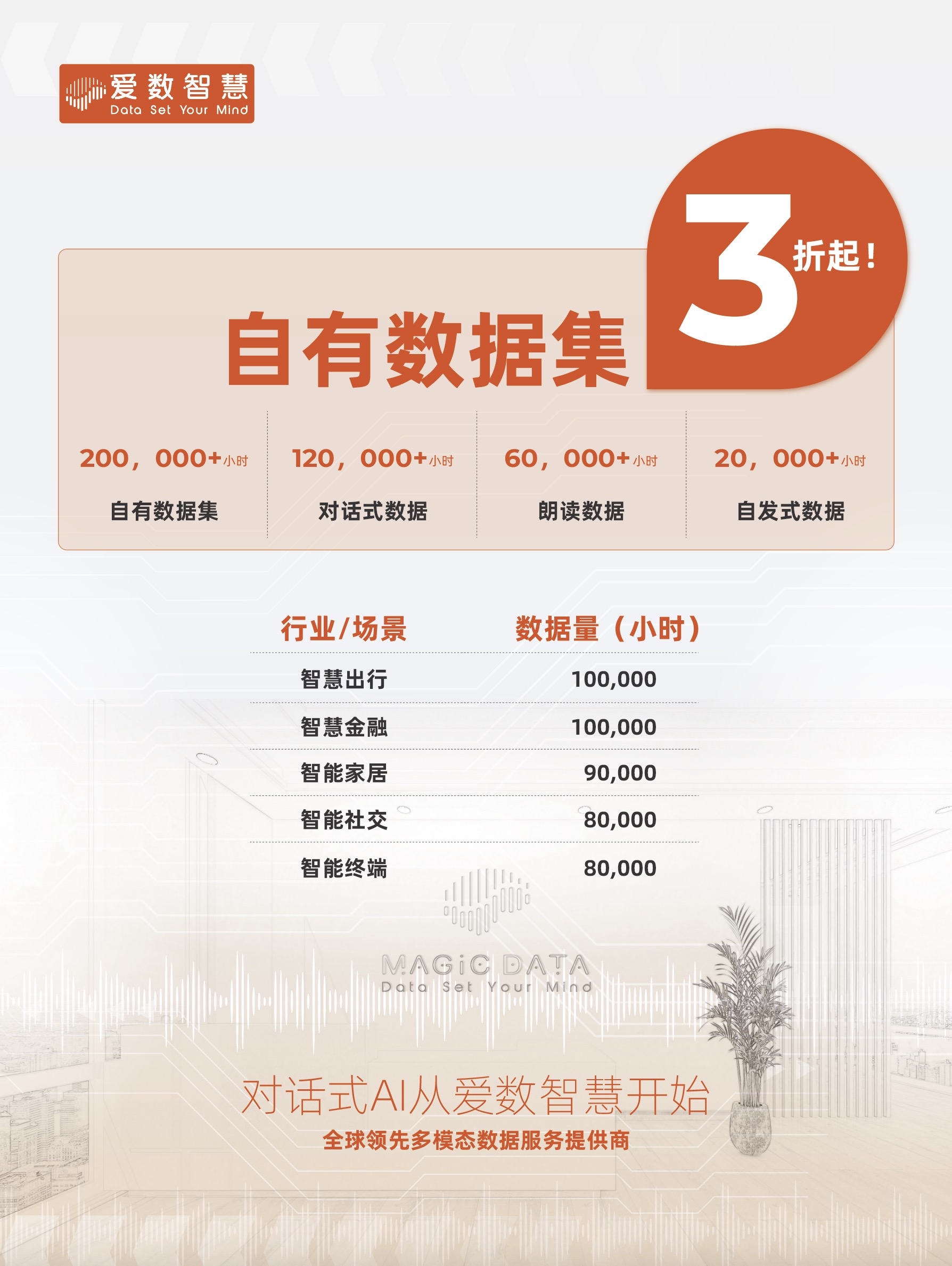服贸会特别活动内容:magic data20万小时自有数据集,涵盖30 语种,8大方言区方言的语音识别(asr)和语音合成(tts)数据集优惠3折起。
