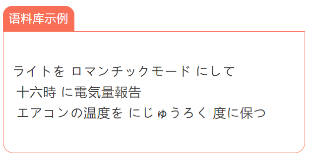 该语料库包含100条日语命令控制相关文本语料,语料库包括智能家居常见命令控制句子,例如灯光控制、洗衣机洗衣时间设定、联系人添加、空调温度调节等。