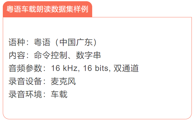 该数据集包含了5个小时的广式粤语朗读音频和转写文本,内容为车载环境中的数字串与命令控制,包含6219条由10名说话人提供的语料。